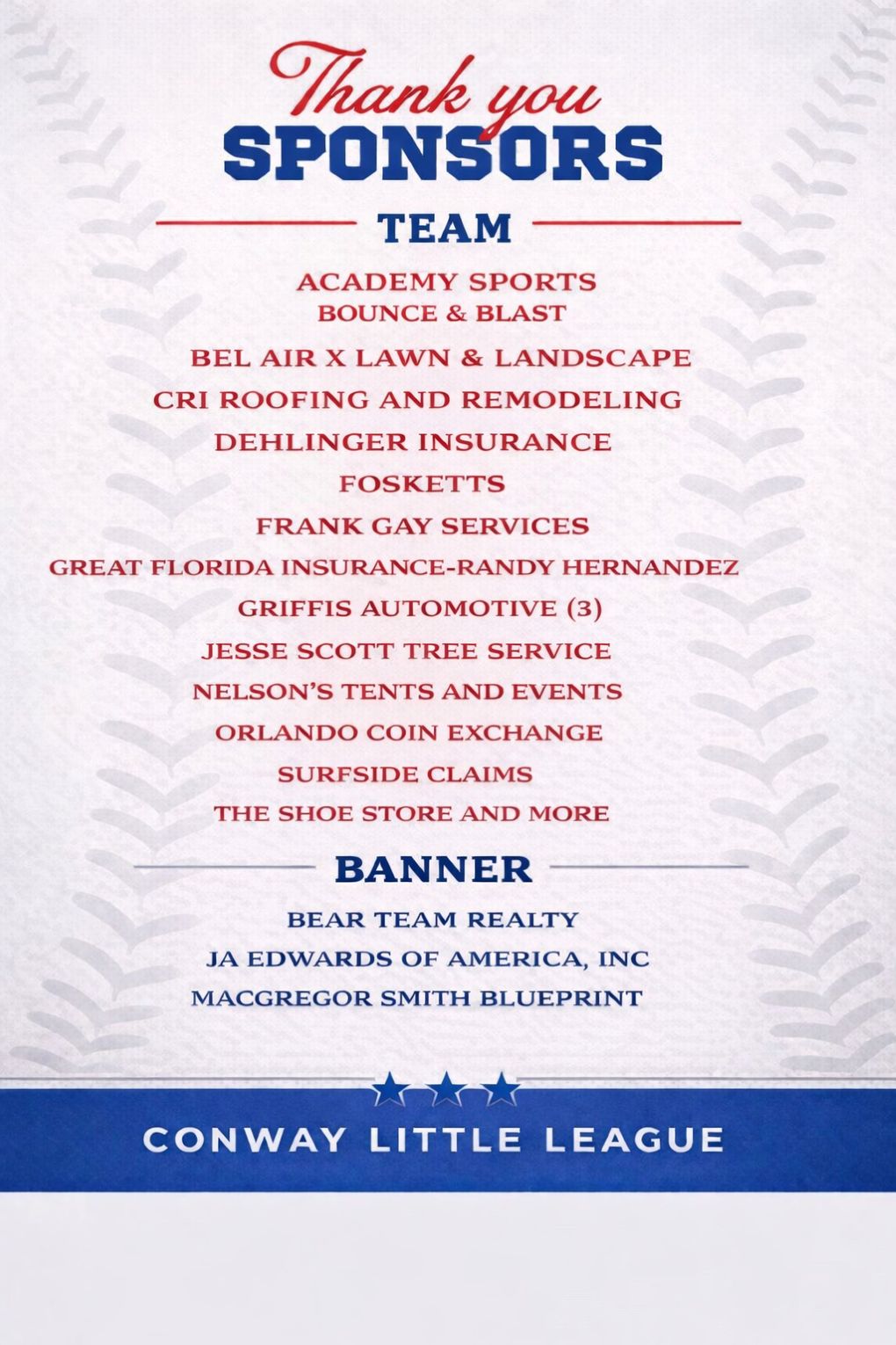 All sponsorships and donations are tax deductible, as Conway Little League is a registered 501(c)(3) organization. A full list of sponsorship levels and opportunities is available for your review.