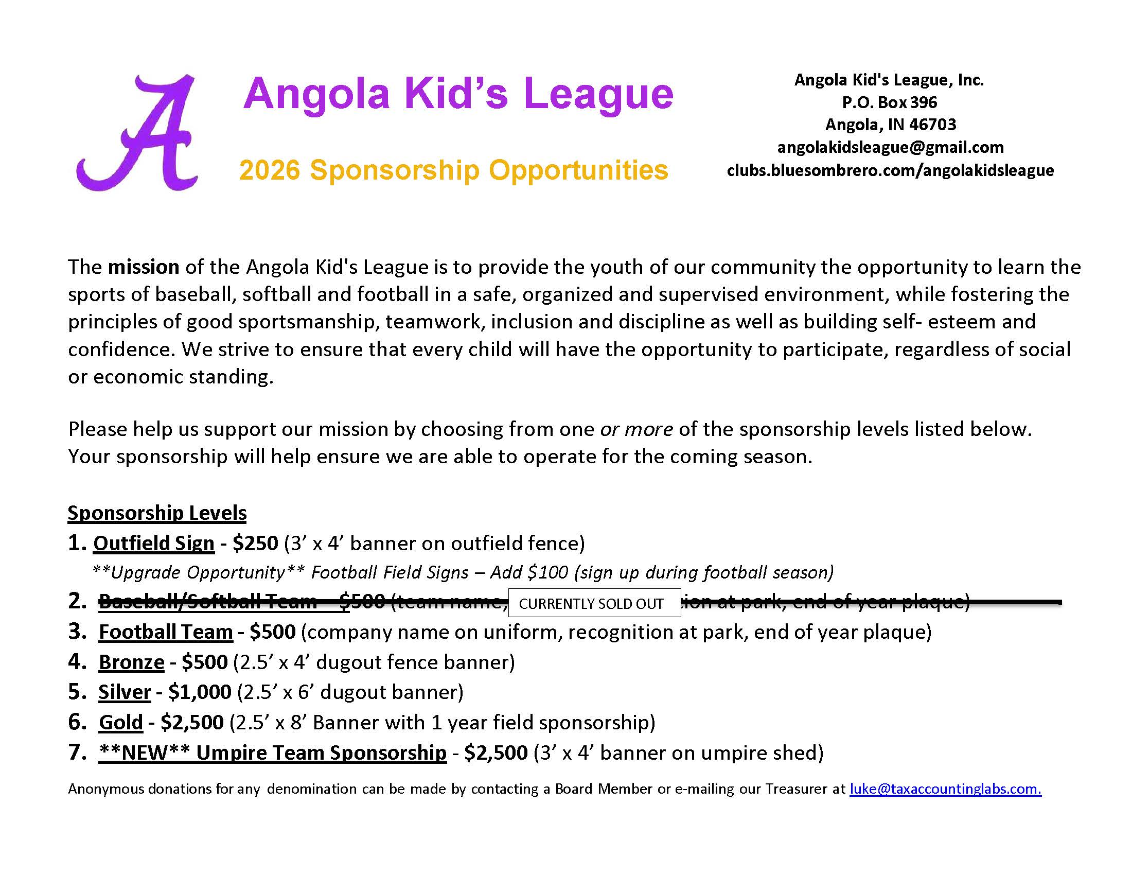At the Angola Kid's League, we're dedicated to providing a safe and fun space for Steuben County's youth to