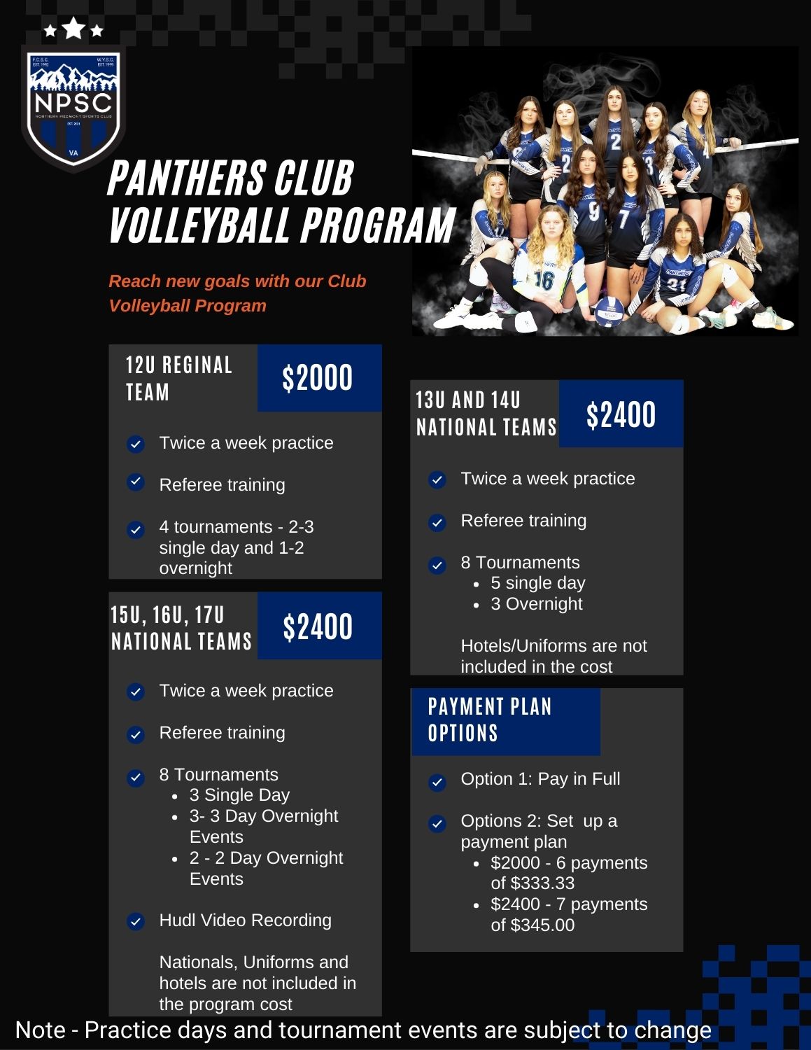 The NPSC United Panther's Travel Volleyball Program is designed for girls ages U13 through U19 who want to focus on high level competition and player development. The program focuses on fast-paced, high-tempo play in which athletes learn to think and react quickly on the court and on mastering fundamentals while building more advanced techniques to prepare for higher levels of competition.
