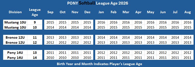 Softball league age for Spring 2026 is based on the player's age as of August 31, 2025.