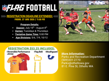 *Final Registration for NFL Flag will close on June 27, 2025. If you are having technical difficulties, please come to the Parks & Recreation office at 81 E. Pine Othello, WA and we can help you register or call 509-331-2770.