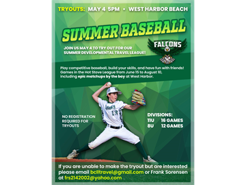 Travel tryouts for 8U and 11U will be Sunday May 4, 5PM at West Harbor Beach. Join us for our summer developmental travel league! Play competitive baseball, build your skills and have fun with friends! Games in the Host Stove League from June-Aug including games at West Harbor. No registration needed to try out. If you are unable to make the tryout but are interested please email