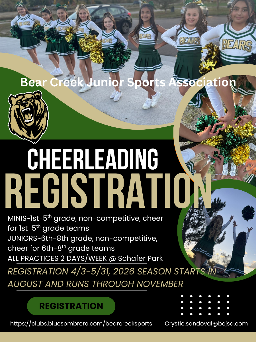 We will promote a positive game-day atmosphere for Bear Creek Junior Sports Association and its athletes. We will instill tradition, honor, commitment and pride in our teams and in each other. Our focus will be learning and mastering the fundamentals of cheerleading at a beginner/intermediate level. Through discipline, teamwork, commitment and sportsmanship, our youth cheerleaders will perform at the junior level but also thrive at the next level. We will bring enthusiasm, pride and teamwork to our community. Our main objective is to allow each member the experience of being part of a team and ensure they enjoy themselves and the sport of Cheerleading.