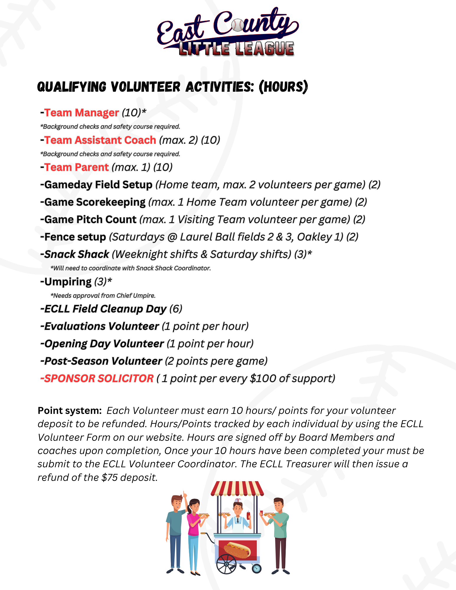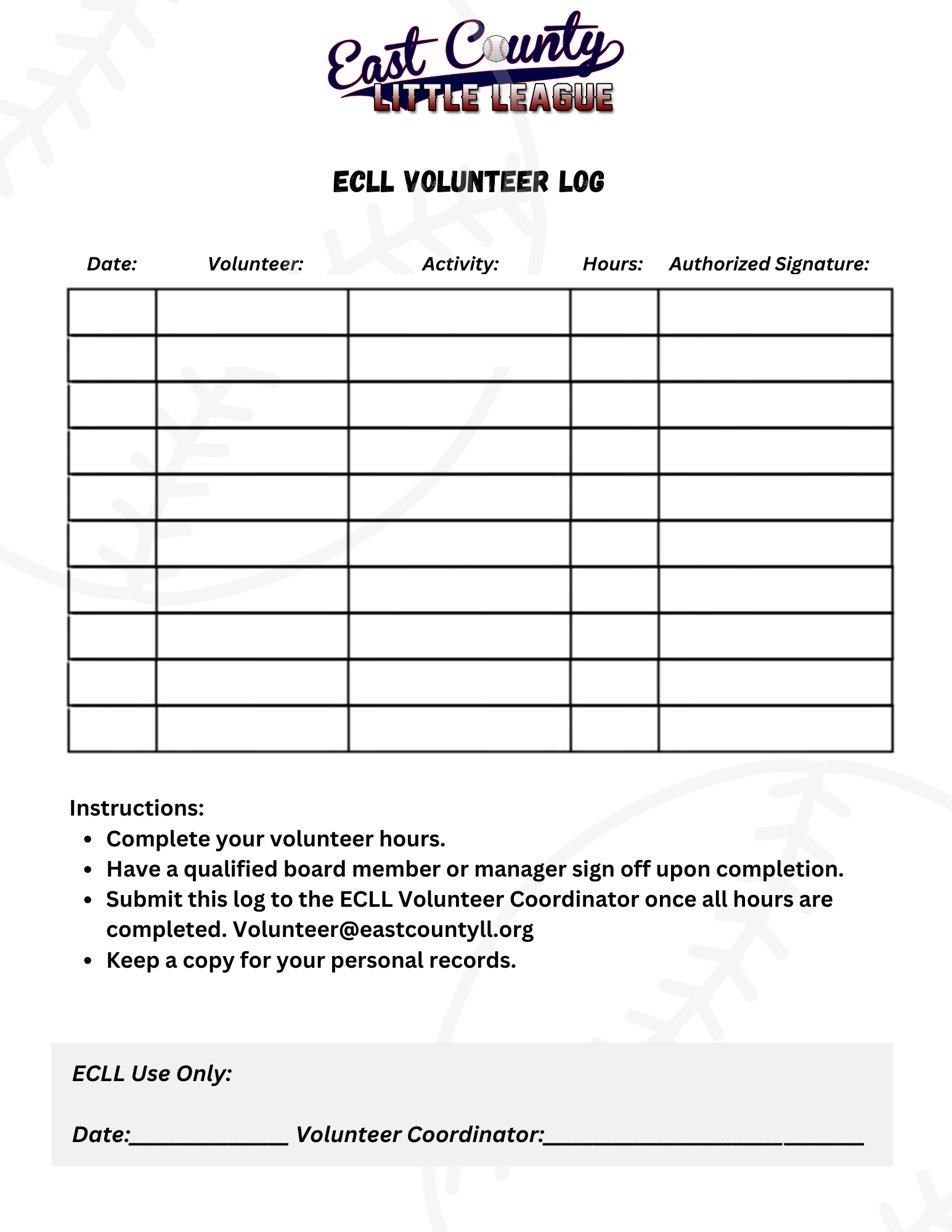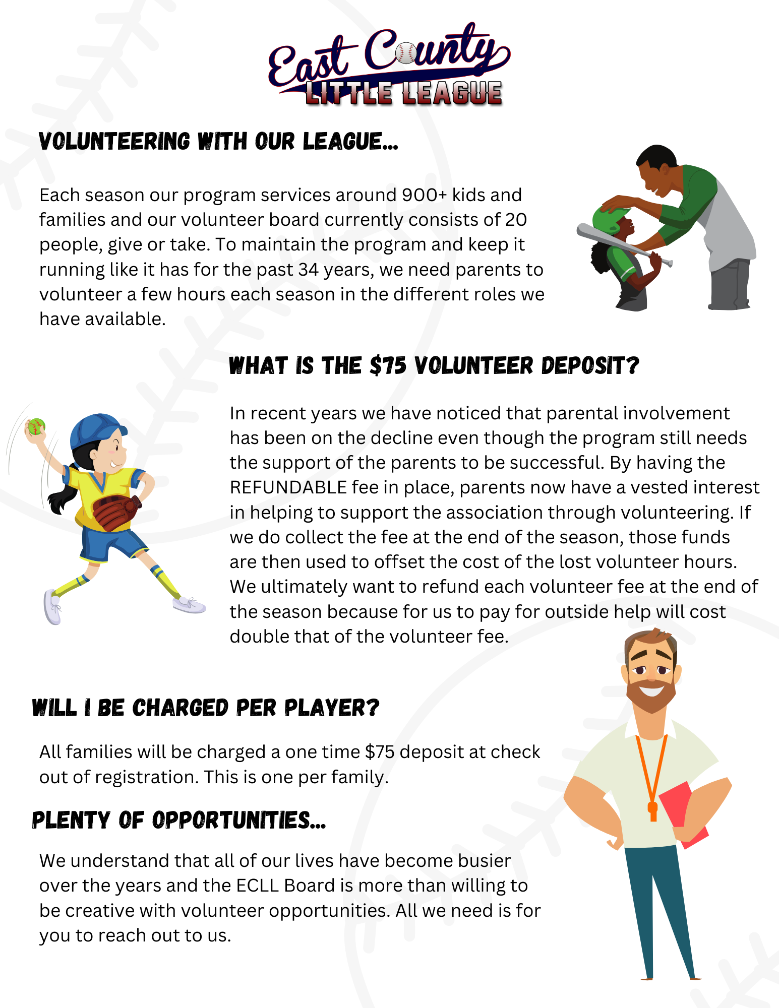 East County Little League is run 100% by parent volunteers in our community. Some of us work full time, some parent full time, some commute and some work in our local business. But ALL equally LOVE our ECLL kids. When you volunteer for ECLL you are not just looking out for the best interest of your own kids, but for 800 other kids. These are kids that your children will grow up with, and you will no doubt be in awe watching all of them grow up before your eyes.