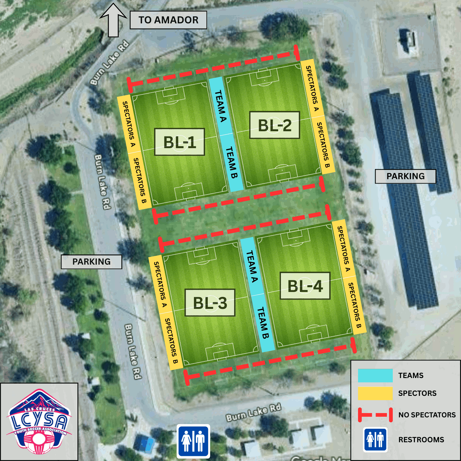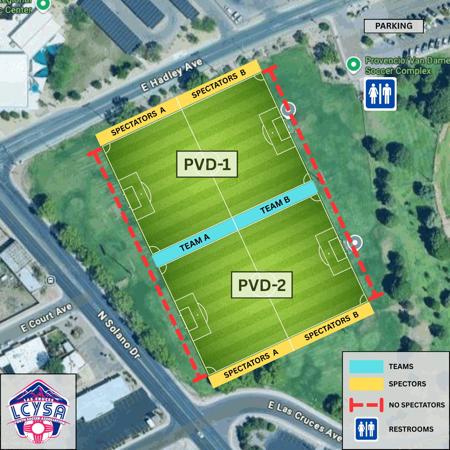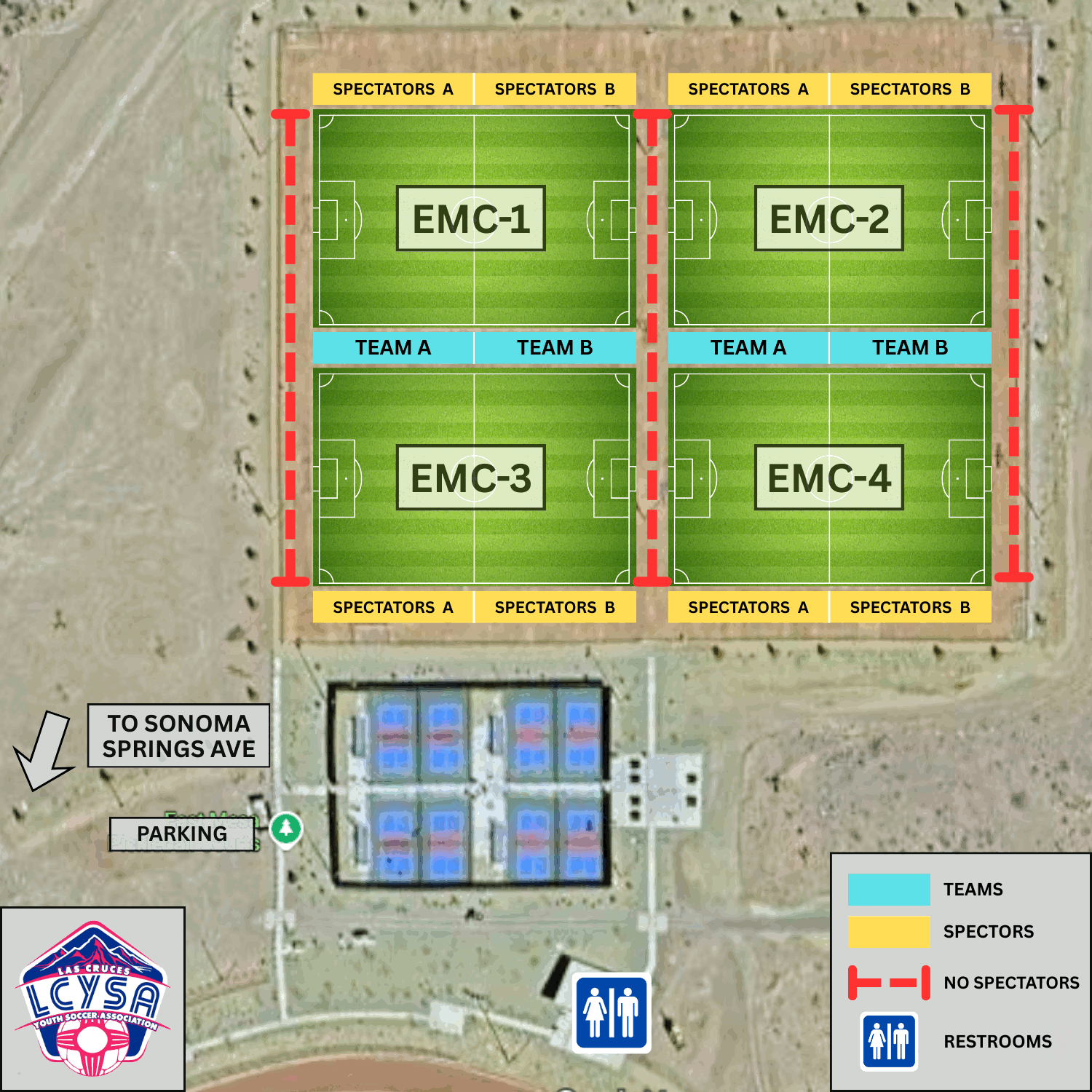 Las Cruces Youth Soccer uses four complexes for games. Please scroll below to find the complex you need. Also, please note the designated areas for Teams (in teal) and for Spectators (in orange). Neither team staff nor spectators are allowed behind the goal areas.High Noon Soccer ComplexHigh Noon (HN) Soccer Complex has 16 fields for U8 & Younger age groups and 3 fields (1 with lights) for U13 and older. All fields can be accessed via Bruins Lane. HN is located near 2004 Bruins Lane in Las Cruces, NM.Provencio-Van Dame Soccer ComplexProvencio-Van Dame (PVD) Soccer Complex has 2 lit fields for U13 and older. PVD is located at 1440 East Hadley Avenue in Las Cruces, NM.Burn Lake Soccer ComplexBurn Lake (BL) Soccer Complex has 4 lit fields for U9 & U10 age groups. BL is located at 451 Burn Lake Rd in Las Cruces, NM.East Mesa Complex Soccer FieldsThe East Mesa Complex (EMC) Soccer Fields has 4 fields for U11 & U12 age groups. EMC near 4502 Sonoma Springs Avenue in Las Cruces, NM. The best access to these field is on Sonoma Springs Avenue. Sometimes the gate on Camino Coyote Lane is locked.