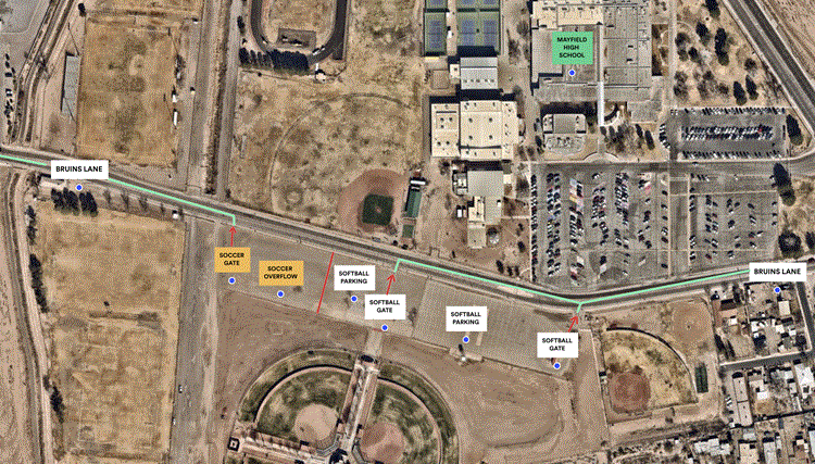 Las Cruces Youth Soccer uses four complexes for games. Please scroll below to find the complex you need. Also, please note the designated areas for Teams (in teal) and for Spectators (in orange). Neither team staff nor spectators are allowed behind the goal areas.High Noon Soccer ComplexHigh Noon (HN) Soccer Complex has 16 fields for U8 & Younger age groups and 3 fields (1 with lights) for U13 and older. All fields can be accessed via Bruins Lane. HN is located near 2004 Bruins Lane in Las Cruces, NM.High Noon Soccer Complex Overflow ParkingHigh Noon (HN) Overflow Parking is shown below. Please use the Soccer Gate (marked in yellow) to use the Soccer Overflow parking. Also, please be aware that if you use the Softball Parking (marked in white), there is a chance that your vehicle could get locked inside the lot.Provencio-Van Dame Soccer ComplexProvencio-Van Dame (PVD) Soccer Complex has 2 lit fields for U13 and older. PVD is located at 1440 East Hadley Avenue in Las Cruces, NM.Burn Lake Soccer ComplexBurn Lake (BL) Soccer Complex has 4 lit fields for U9 & U10 age groups. BL is located at 451 Burn Lake Rd in Las Cruces, NM.East Mesa Complex Soccer FieldsThe East Mesa Complex (EMC) Soccer Fields has 4 fields for U11 & U12 age groups. EMC near 4502 Sonoma Springs Avenue in Las Cruces, NM. The best access to these field is on Sonoma Springs Avenue. Sometimes the gate on Camino Coyote Lane is locked.