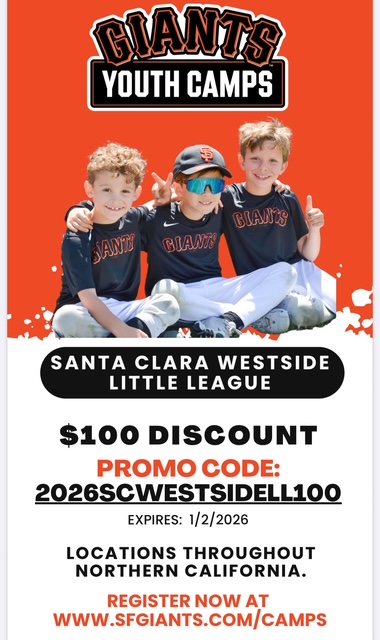To find camp locations and redeem your exclusive discount, visit www.SFGiantsCamps.com and enter 2026SCWestsideLL100 in the promo code section of the application.