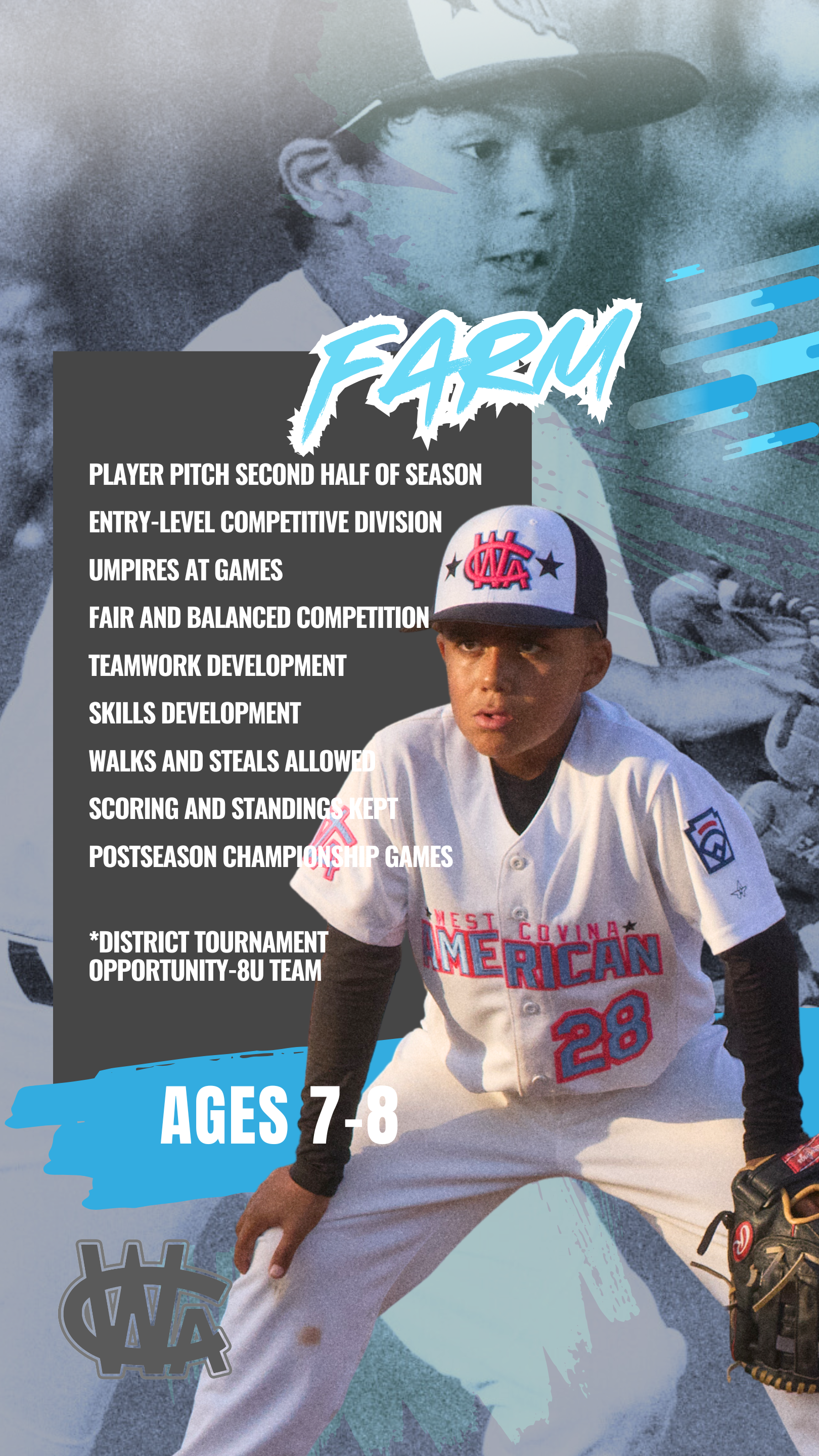 In the Farm Division, players transition to a more competitive format, with coach pitch first half of the season and player pitch second half. Umpires officiate games, and players develop their skills and teamwork while learning more about walks, steals, scoring, and standings. Games have official scoring, and standings are recorded since teams compete for a division championship.