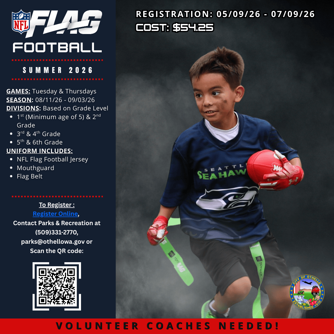 The Parks and Recreation Department provides sample uniforms for athletes to try on in order to determine the correct size before placing an order. These try-on uniforms are available at the Parks and Recreation Department office, located at 81 E. Pine Street, Othello, WA 99344. Office hours are Monday through Friday, 8:00 AM to 5:00 PM.