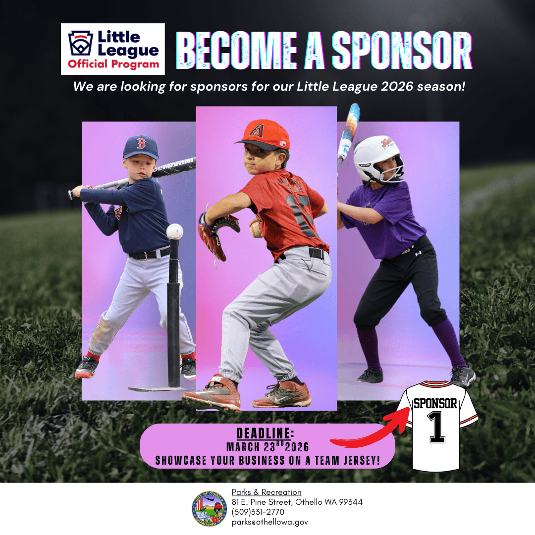 SPONSOR SPOTLIGHTPlease support the businesses that support Othello Parks & Recreation Little League. We appreciate the generosity of our community businesses! Your contribution is vital to the success of our program. We truly appreciate your interest in helping us thrive for the benefit of the children in this community. You can rest assured that your generous donations are being put to good use for our Little League program. Donations/Contributions to SOCCER, FLAG FOOTBALL will have a banner displayed at the league game locations. If you would like to be a sponsor, please contact the Parks and Recreation Department at 509-331-2770 or go to our city page to download a contribution form that can be turned in to the City Hall.------------Sponsorship Form------------ Contributions to the City of Othello Parks & Recreation are tax-deductible.City of Othello- Parks & Recreation Department will provide a receipt that can be used for tax purposes. IF APPLICABLE TO YOUR DONATION PLEASE EMAIL YOUR LOGO TO [email protected]