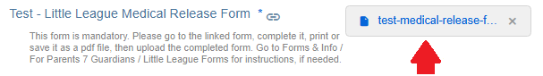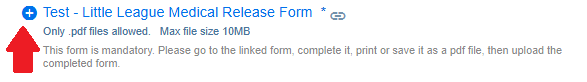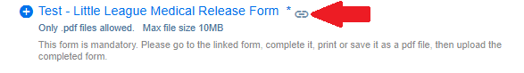 How to complete and upload the Little League Medical Form during the registration process:1. Click the link icon next to "Little League Medical Release Form".