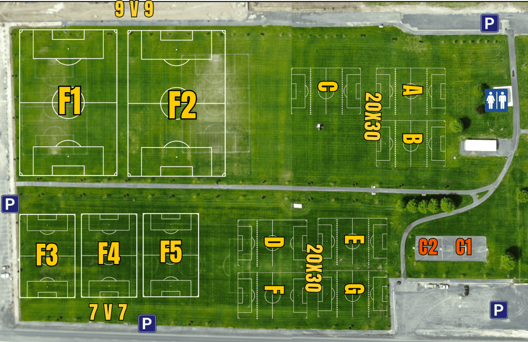 • Field A-F: 5v5 (20x30 yards)