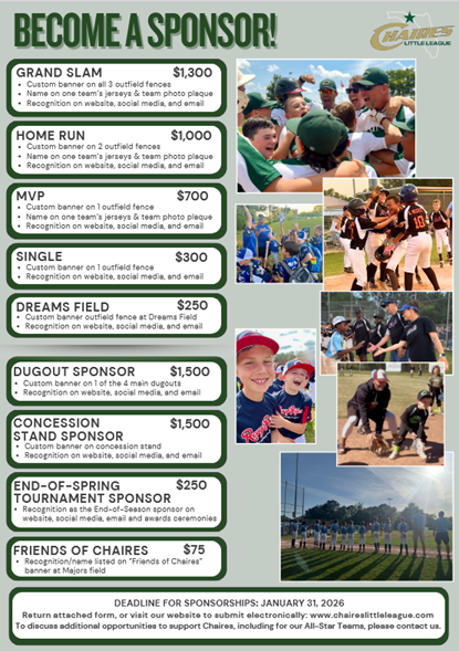 Chaires Little League is Tallahassee’s largest youth baseball league, serving nearly 400 players each season. Chaires’ mission is simple - to provide a fun, supportive and enriching Little League environment where every player can develop, succeed and build lasting memories. With a focus on teamwork, character, and community, we strive to provide a positive environment for each player, each family, identifying what success means for each and helping them achieve it.
