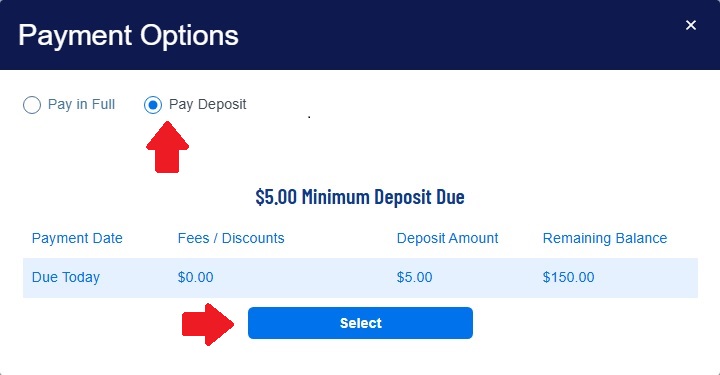 2. A dialogue box will open. Choose “Pay Deposit” from the radio buttons then click the Select button.