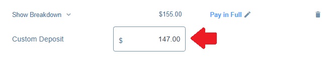3. The dialogue box will close. There should be a field labeled “Custom Deposit”; insert 147.00into that field. Click the Continue button to move to the Payment screen.