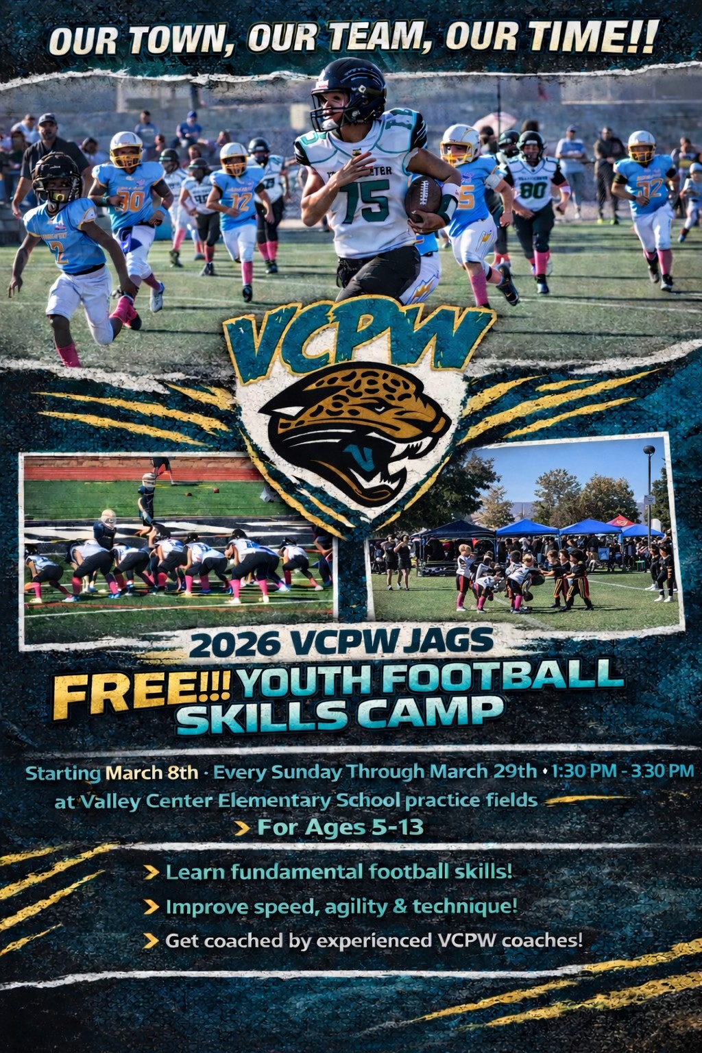 Come out and join the VCPW Jags football coaches for a fun and exciting skills camp, starting Sunday, March 8th at 1:30 PM. The event is FREE and will be held at the Valley Center Elementary practice fields. The camp will cover both defensive and offensive skills, and is a fantastic chance to build fundamentals, conditioning, and confidence on the field.