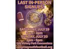 Smyrna Youth Football & Cheer's LAST face to face sign- ups and equipment fitting. Both Saturday, July 19th from 9am to 3pm and Sunday, July 20th from 1pm to 5pm at Lee Victory Park Football Concession Stands. Come out and sign up and get fitted. Sign-ups are still open online at smyrnayouthfootball.org