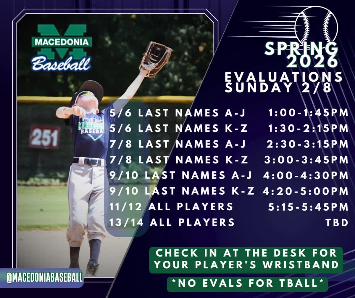 *Player Draft: The player drafts will be held at the field for coaches only Your child’s coach or team mom will contact you by when your team is set. Practices will start soon thereafter. Stay tuned to our website for updated information www.macedoniabaseball.org.