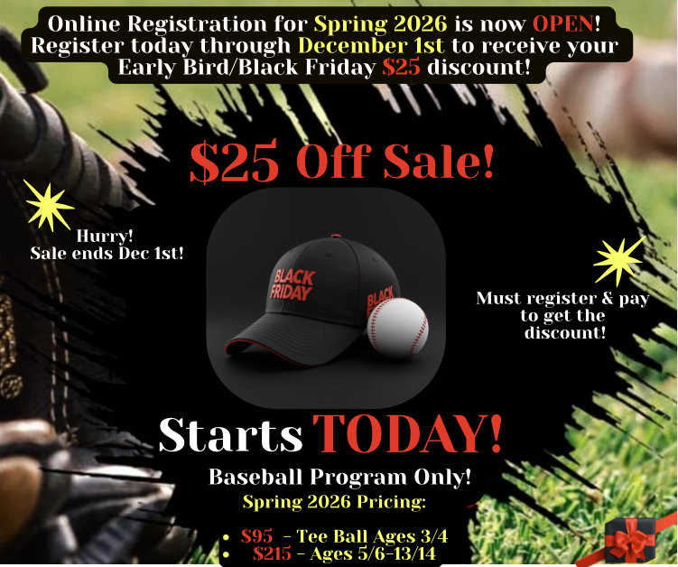 *Players need to come to evaluations prepared to play ball: Wear cleats (ideally because tennis shoes may slip) & appropriate clothing. Bring a baseball glove, bat, & batting helmet.