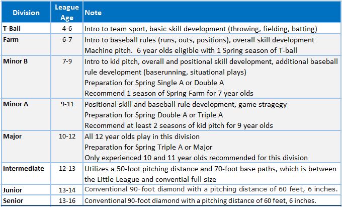 - The Little League Baseball program includes divisions for all children, ages 4–16. In addition to practicing on-field fundamentals and skill development, Little League Baseball pridefully enlists the sport to strengthen its participants’ self-esteem and confidence