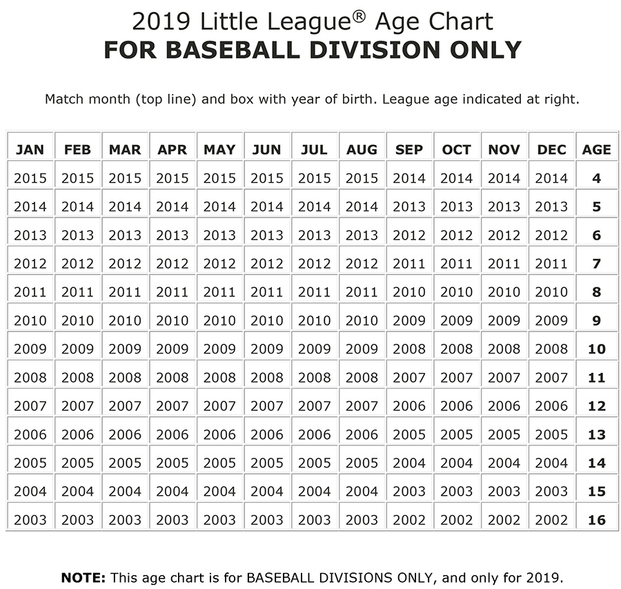 Little League International establishes the League Age rules. To confirm your player's league for the Spring 2019 season use Little League's League Age Calculator, or use the Leageu age chart below.