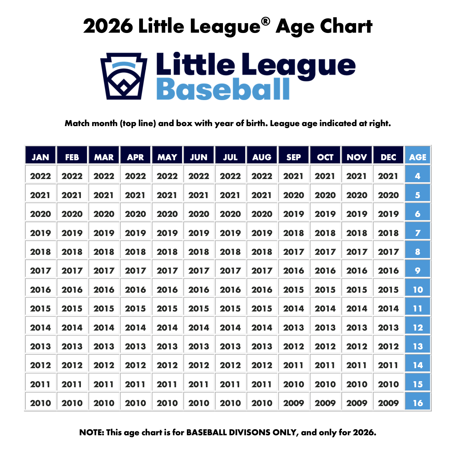 2026 Little League Age Charts