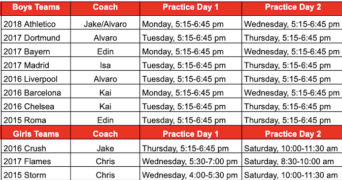 Fall 25' Practice Schedule for Travel Teams