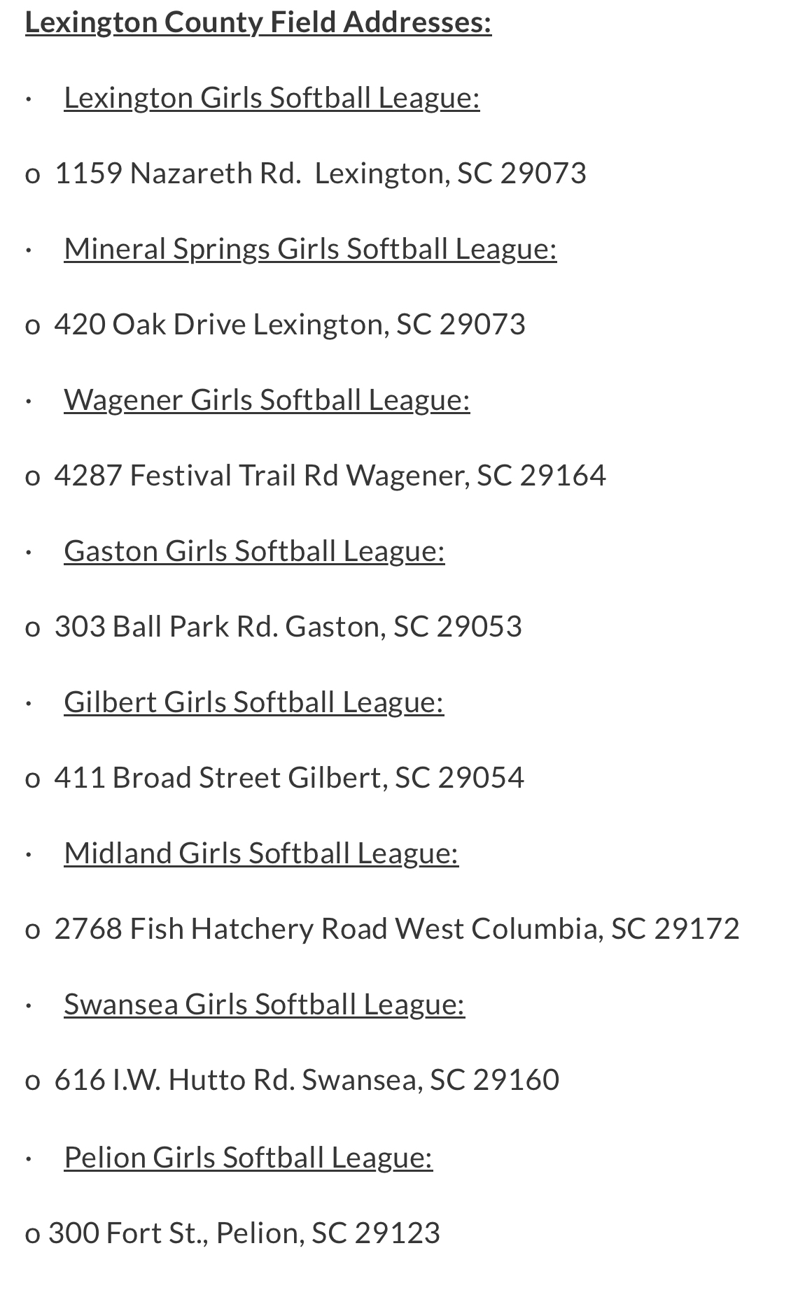 Gilbert Girls Softball League PO Box 545 Gilbert, South Carolina 29054